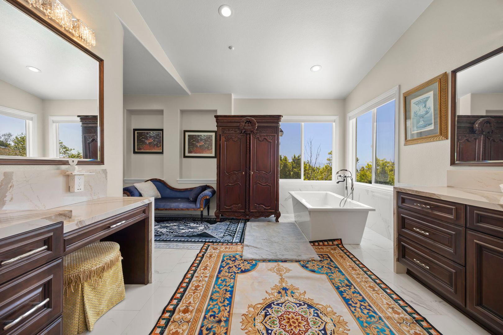 With five generously sized bedrooms and five-and-a-half bathrooms, the floorplan includes a convenient guest suite on the lower level and an impressive primary suite upstairs complete with a cozy fireplace, spa-like bath with soaking tub and separate shower, dual vanities, dual walk-in closets, a private sitting room, and a balcony overlooking panoramic vistas.