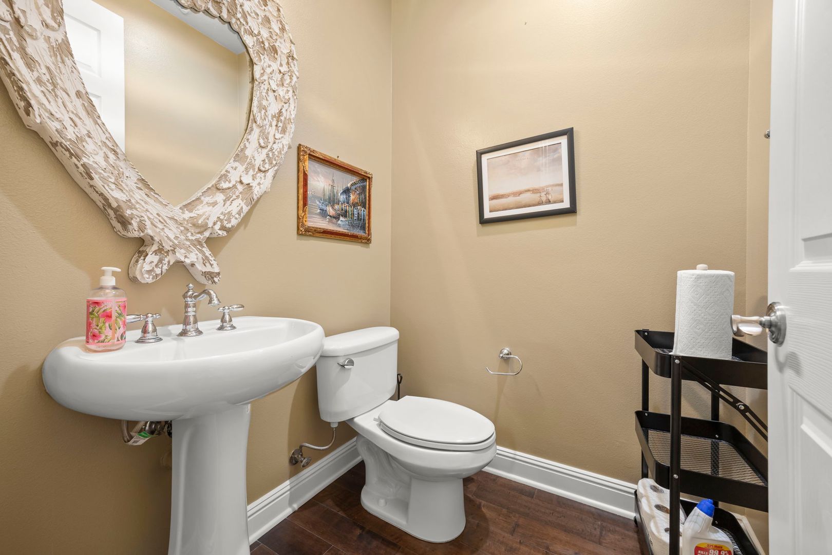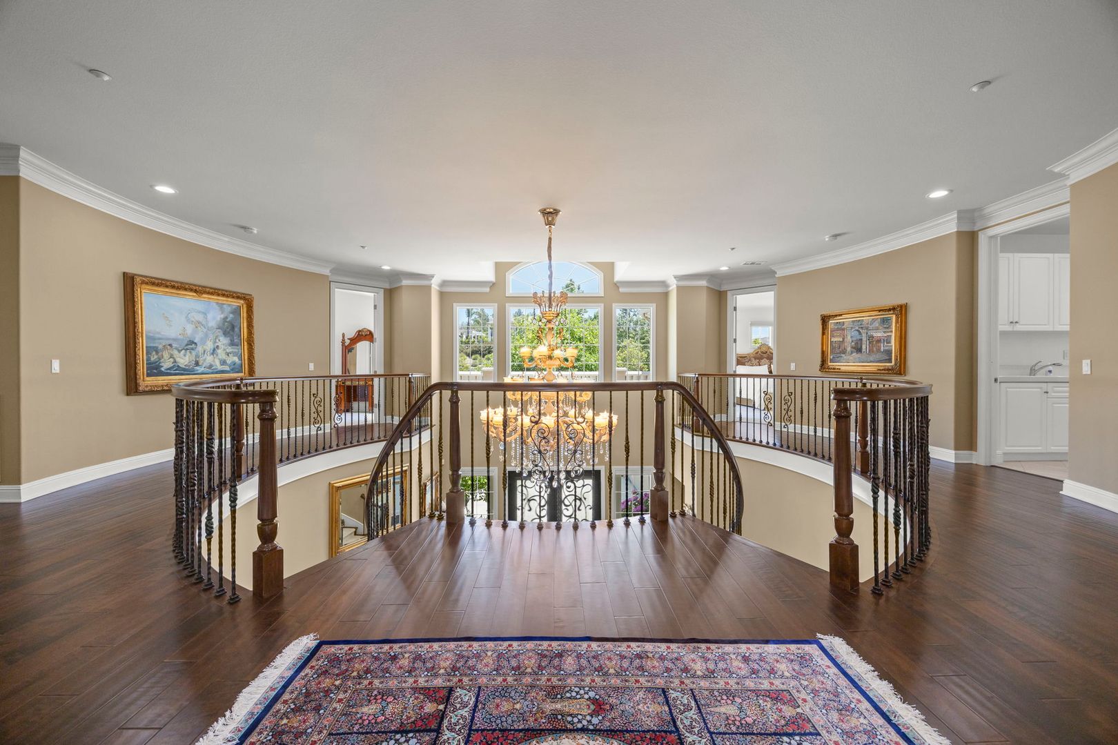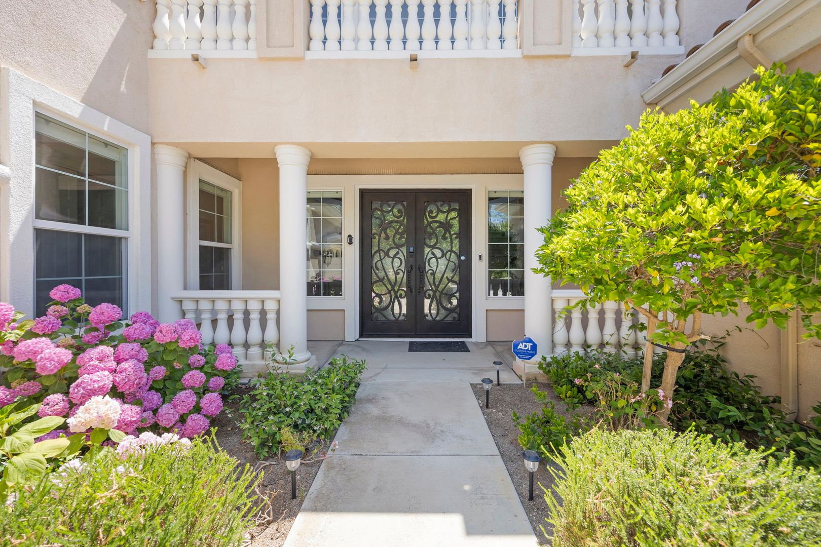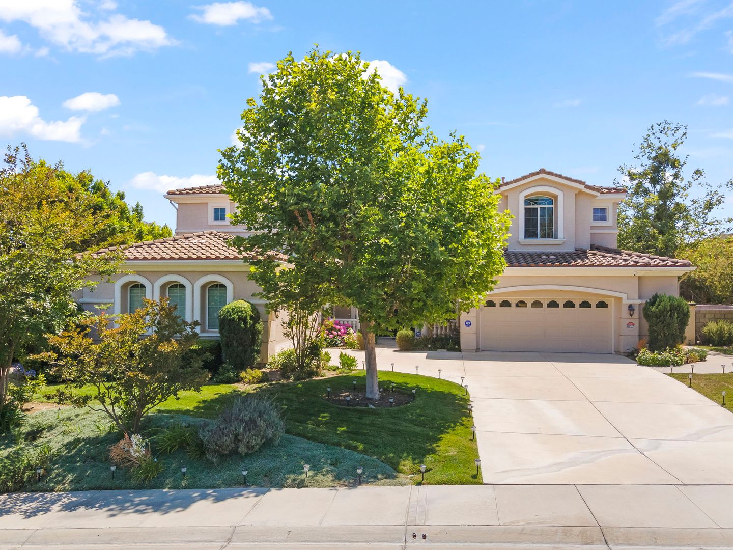 Beautiful hardwood flooring, architectural accents, and oversized windows enhance the home's classic Mediterranean charm. Other highlights include upstairs laundry, a walk-in pantry, and dual two-car garages offering ample parking and storage.