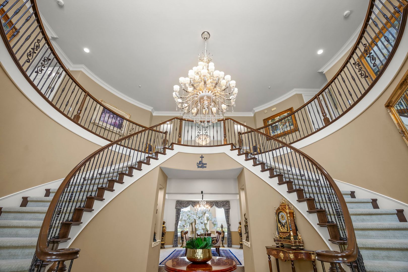 Inside, a dramatic two-story foyer with a sweeping dual staircase sets the tone for timeless sophistication. The layout is ideal for both entertaining and everyday comfort, with a gourmet chef’s kitchen that flows seamlessly into a spacious family room, and a formal dining room perfectly suited for hosting elegant gatherings. A private home office offers a quiet retreat for working or studying from home.