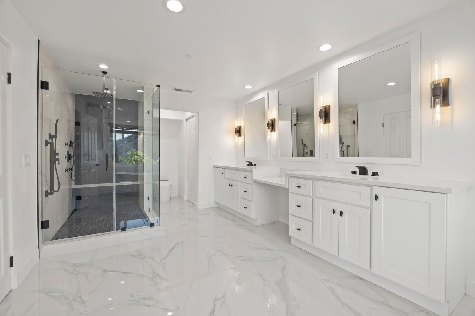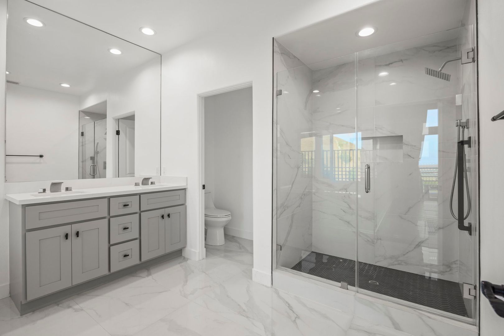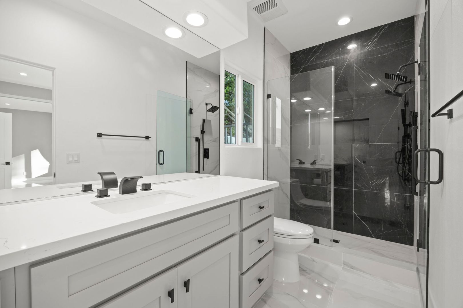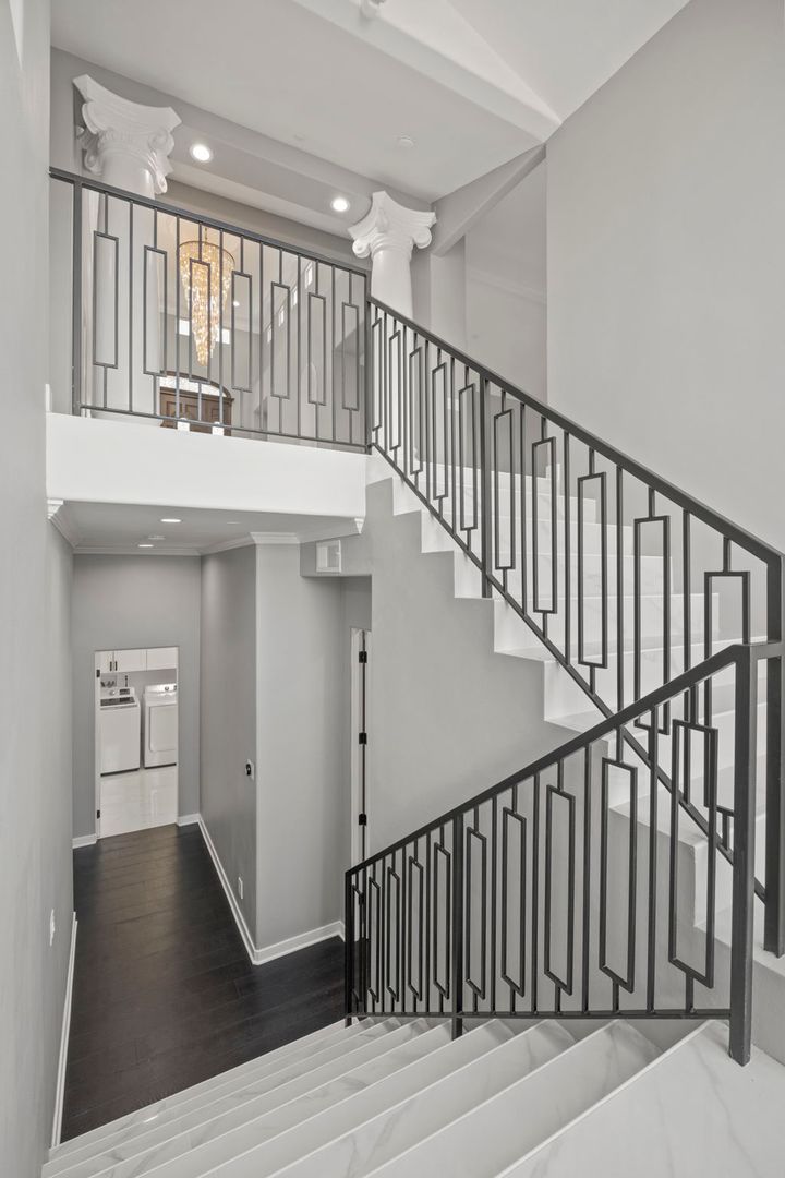 Inside, the floor plan flows beautifully with open-concept living and dining areas, hardwood and tile flooring, and oversized windows that invite the outdoors in. Two spacious primary suites provide luxurious retreats, each with spa-style baths and generous custom closets. A ground-level room offers flexibility as a home office, gym, or guest quarters.